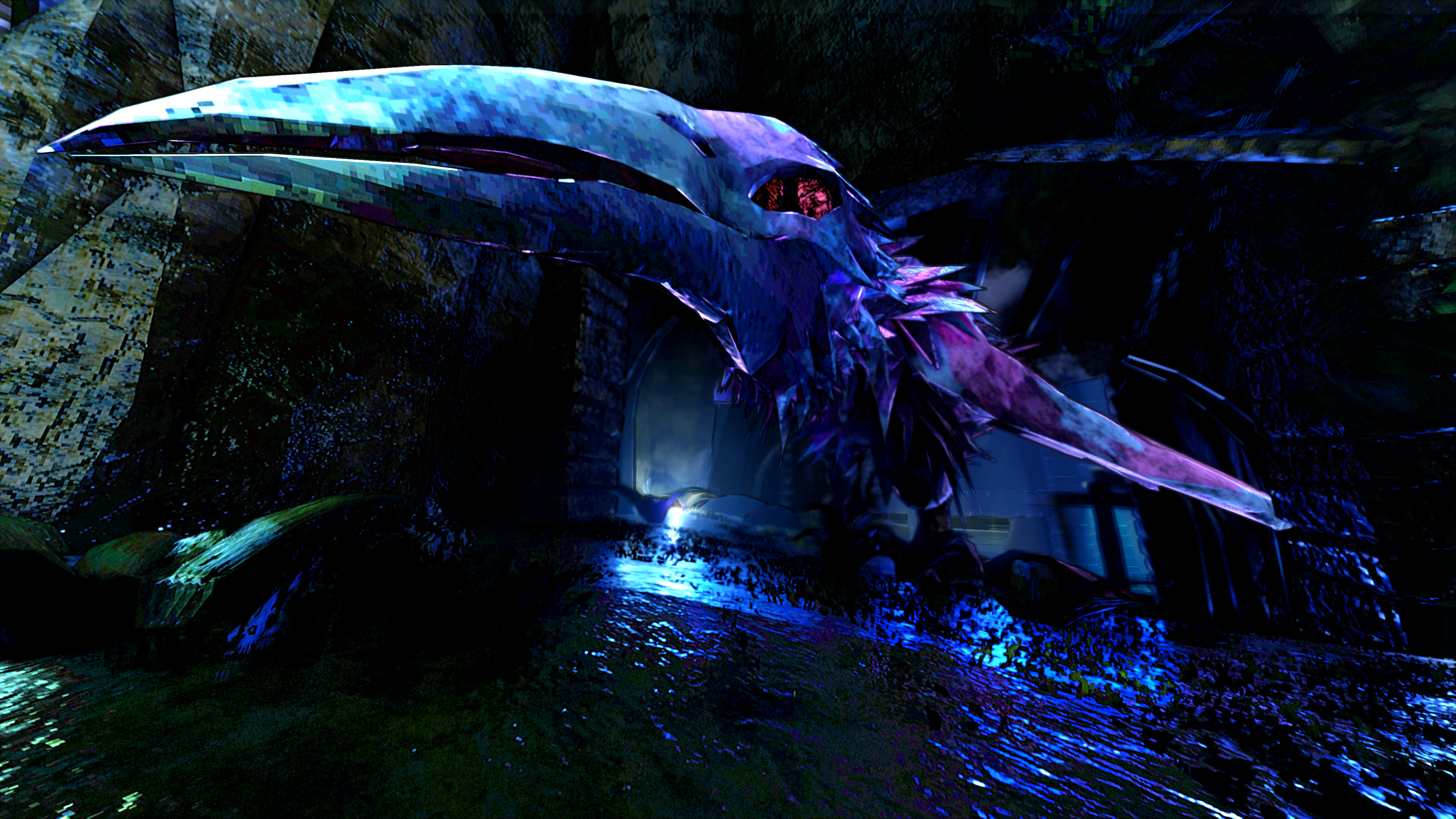 A raven creature created in Blender and rendered in Unreal Engine 4 this time. I was wondering how to create the background for this piece and since I had some scenes ready in UE4, I thought I'll use one of those as a background. The artstyle here has very pixelated textures and a rather low polycount.